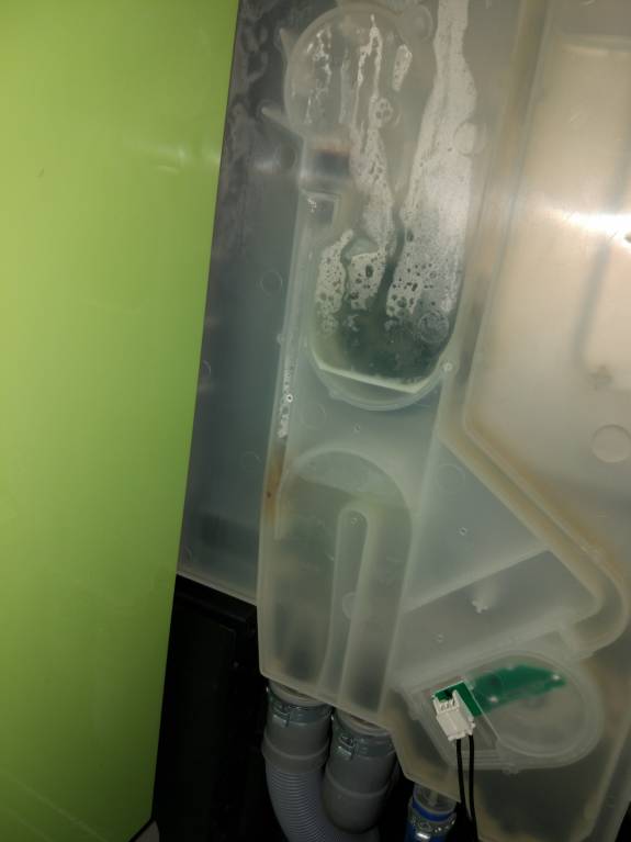 The car is a little over a year old, the warranty has of course expired((And then this error came out. Overflow. There is a puddle on the floor. I drained the water (put it on its side). The error went away, the machine is working. I removed the side walls, there is a flat cassette on the left, sort of like a pressure take-off. So Here, in the channel on the left in the photo, there is a fatty plug. When washed with detergent, it is not removed. How to remove it or not to steam it? What does it affect? Thanks to those who answered.