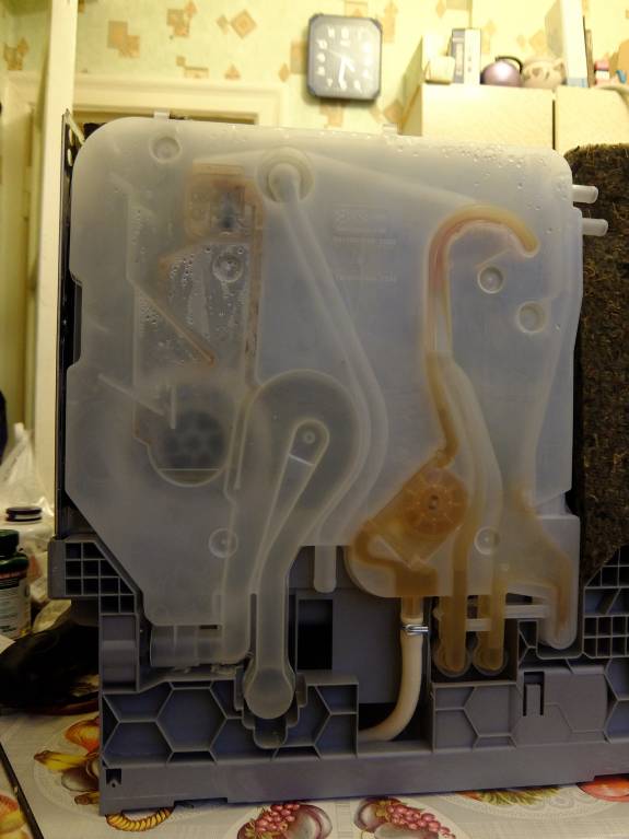 Then he carefully pulled the water fill/drain system to the left edge (according to the photo) so that his hand could fit through and removed the o-ring. I washed away the limescale deposits from it. Over 5 years of work, the ring remained soft and was not damaged anywhere.