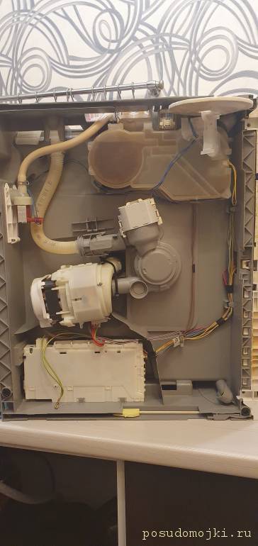 Good people. Tell me, I’ll resuscitate PMM at home. Machine SKS50E12RU/05 ... Works through the program, and upon completion freezes. I think the machine is hanging at the drying stage. I’m not much of a repairman, but apparently there is a problem either in the temperature sensor or in the brain, because throughout the entire hang time the heating element is burning. Tell me where this sensor is and how to ring it. I have attached a photo of the giblets.
